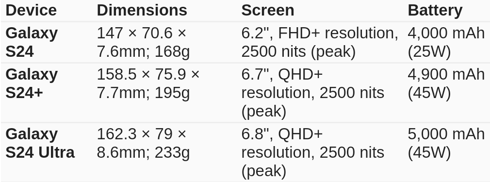 Πιο συγκεκριμένα, το S24 θα έχει οθόνη στις 6.2 ίντσες ενώ στα άλλα δύο μοντέλα της σειράς, το S24+ θα έχει μικρότερα bezels με QHD+ ανάλυση ενώ το Ultra θα διατήρηση την ίδια 6.8 QHD+ οθόνη.