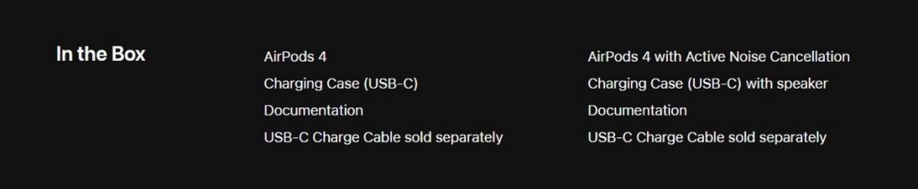 Τα AirPods 4 και AirPods 4 με Active Noise Cancellation δεν έχουν μέσα στα κουτιά τους το καλώδιο, σύμφωνα με την επίσημη σελίδα της Apple, που το αναφέρει στα περιεχόμενα των συσκευών.